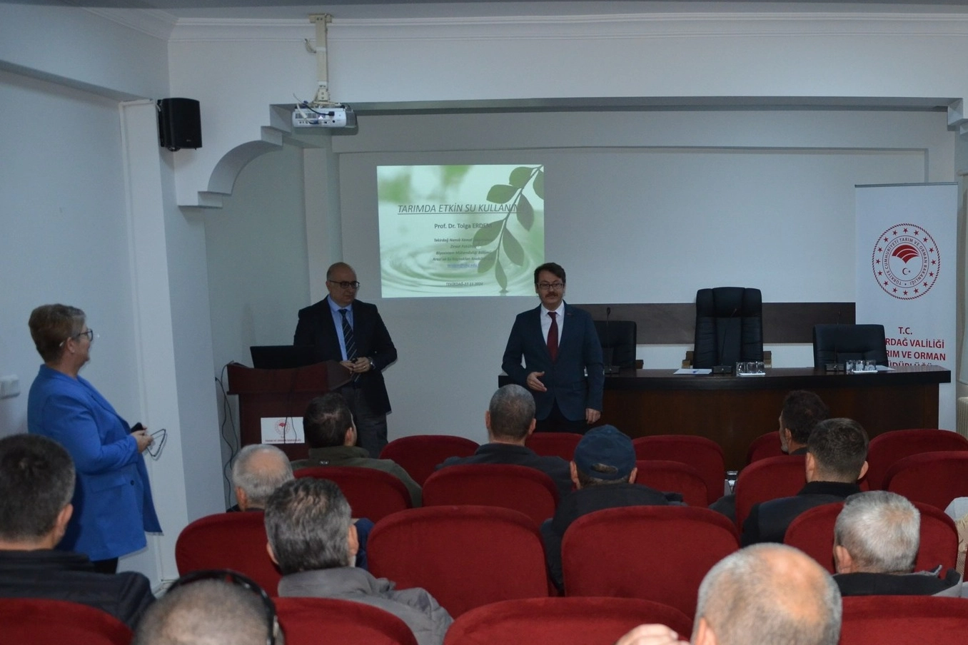 Tekirdağ İl Tarım ve Orman Müdürlüğü toplantı salonunda gerçekleştirilen 'Tarımda Suyun Etkin Kullanımı' konulu çiftçi toplantısı, İklim Değişikliği ve Kuraklıkla Mücadelede Verimli ve Bilinçli Sulama temasıyla 2024 Yılı Çiftçi Eğitim ve Yayım Faaliyetleri çerçevesinde düzenlendi. Toplantıya 50 çiftçi ile tarım paydaşı sivil toplum kuruluşlarının temsilcileri katıldı. Toplantıda, Tekirdağ Namık Kemal Üniversitesi Biyosistem Mühendisliği Bölümü Öğretim Üyesi Prof. Dr. Tolga Erdem bir sunum gerçekleştirdi. Sunumda, Türkiye'nin mevcut sulama durumu ele alınırken, tarımda suyun ne kadar önemli olduğu ve etkin kullanılmasının çevresel ve ekonomik faydaları detaylıca açıklandı. Prof. Dr. Erdem, kapalı sistem su dağıtım ağlarının avantajları, basınçlı sulama yöntemlerinin su tasarrufuna katkısı, uygun sulama zamanı ile bitki gelişimi ve verim artışı arasındaki ilişki gibi konular üzerinde durdu. Erdem, Trakya Bölgesi’nin sulama ihtiyaçlarına yönelik bilimsel analizler ve çözüm önerilerini paylaştı. Erdem, iklim değişikliğinin su kaynakları üzerindeki olumsuz etkilerine dikkat çekerek, kapalı sulama sistemlerinin ve modern sulama teknolojilerinin yaygınlaştırılmasının önemini vurgulayarak, tarımsal üretimde sürdürülebilirliğin sağlanabilmesi için bilinçli sulamanın şart olduğunun altını çizdi. Toplantının ikinci bölümünde çiftçilere, Tarım ve Orman Bakanlığının Yeni Destekleme Modeli tanıtılarak, bu modelin su kaynaklarının etkin kullanımı ve tarımsal üretimin artırılmasındaki rolü anlatıldı. Çiftçilerin sulama ve destekleme modelleri hakkındaki soruları yanıtlanarak interaktif bir eğitim ortamı oluşturuldu.