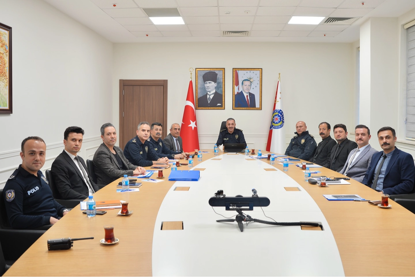 Emniyette gerçekleştirilen toplantıda, kentin huzur ve güven ortamının devamı için alınması gereken ilave tedbirler ve yapılması planlanan faaliyetler görüşüldü.