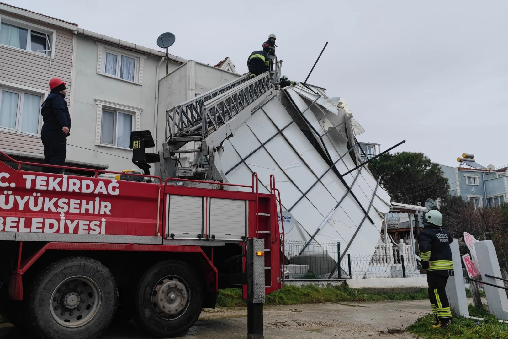 Gece saatlerinde aniden şiddetini artıran fırtına, Kızılcaterzi Mahallesi'nde bulunan yazlık sitelerde hasara yol açtı. Kuvvetli rüzgarın etkisiyle bazı binaların çatıları yerinden koparak site bahçelerine ve yollara düştü. İhbar üzerine bölgeye belediye ekipleri sevk edilirken, uçan çatı parçalarının kaldırılması için çalışma başlatıldı. Olayda can kaybı ya da yaralanma yaşanmadığı öğrenilirken, ekiplerin hasar tespit çalışmalarını sürdürdüğü bildirildi.