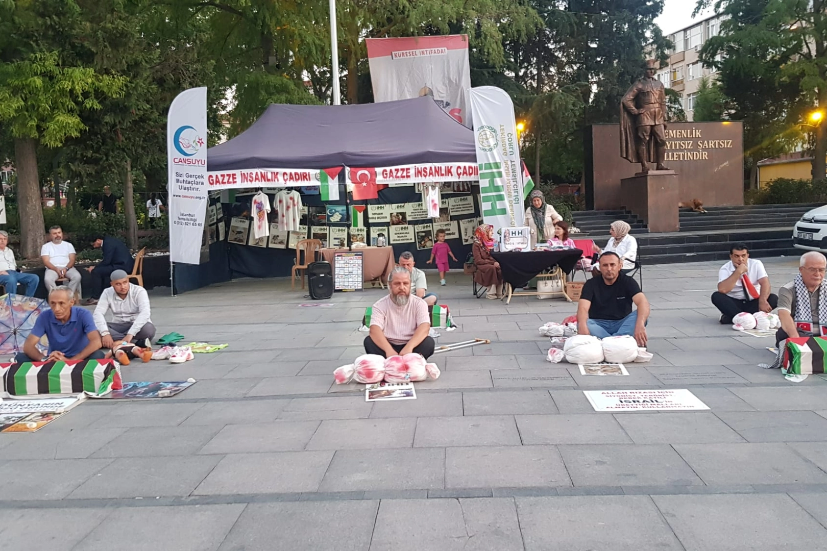 Atatürk Meydanı'nda kurulan alanı dernek üyeleri, Türkiye ve Filistin bayraklarıyla donattı. Alan içerisine tabutlar, kefenler, oyuncaklar, ayakkabılar ve elbiseler bırakıldı.