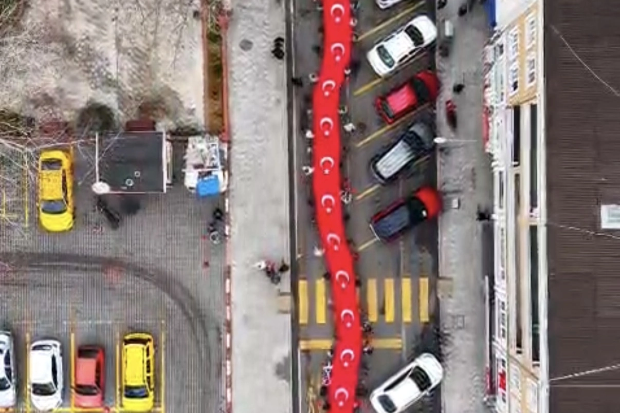 Okul bahçesinde toplanan öğrenciler, ellerindeki yaklaşık 100 metrelik Türk bayrağıyla Mustafa Kemal Caddesi'nde yürüdü.