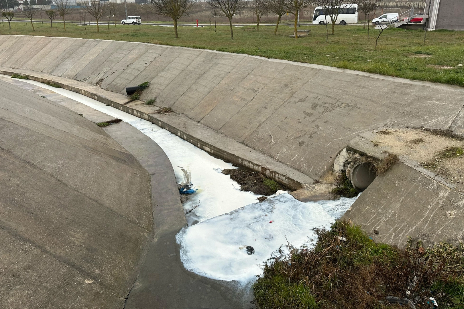 Çerkezköy Organize Sanayi Bölgesi içerisinden geçen derenin beyaz aktığını gören vatandaşlar durumu yetkililere bildirdi.