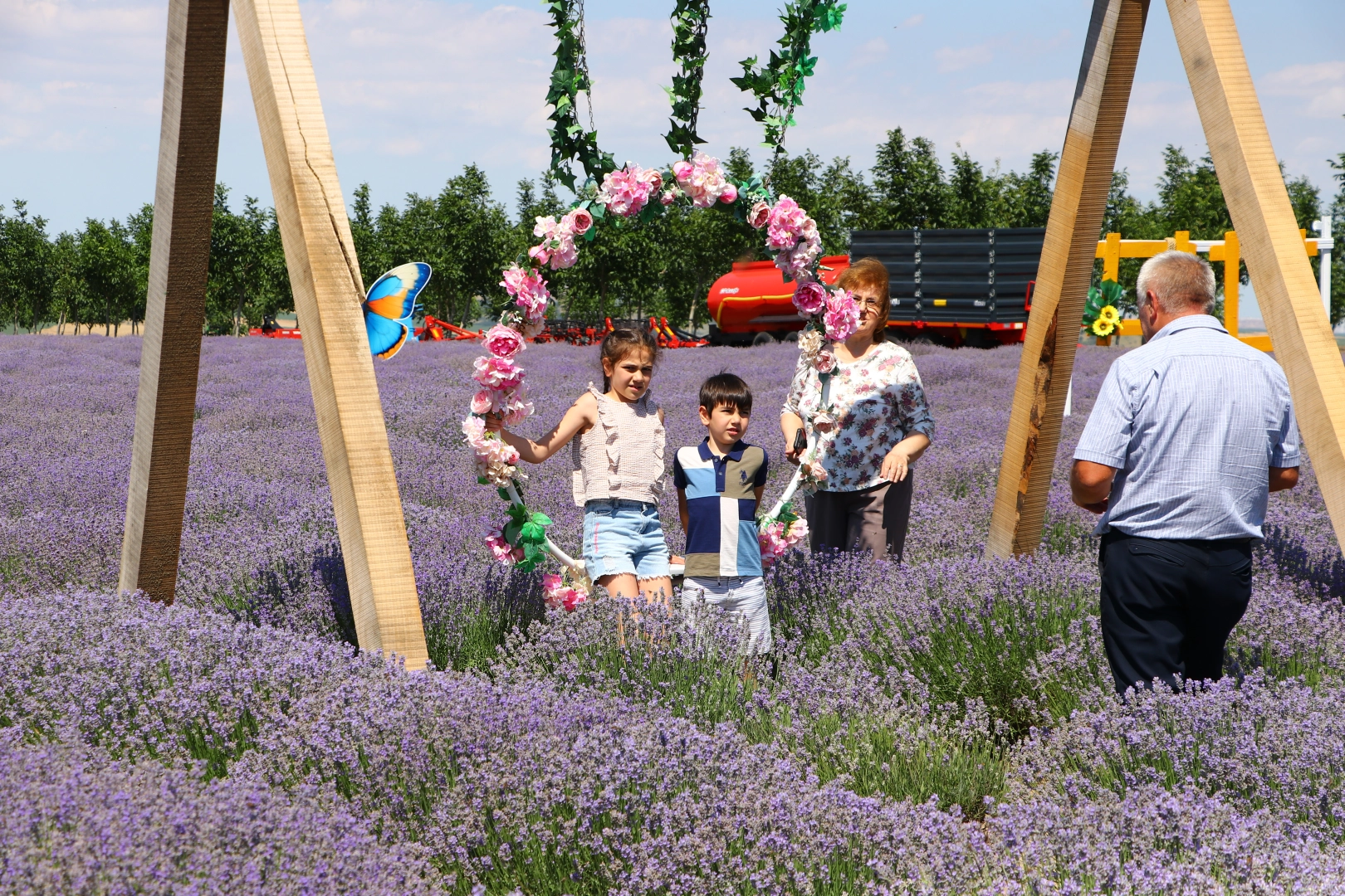 Ziyaretçiler, göz alıcı mor ve eflatun renkleriyle dikkat çeken lavanta tarlalarında oluşturulan dekorlar önünde en güzel fotoğraf karesini yakalamaya çalıştı.