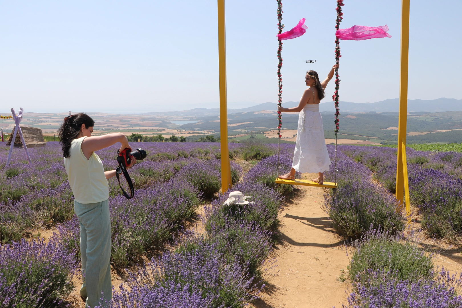 Ziyaretçilerin yanı sıra fotoğraf tutkunları da lavanta tarlalarında oluşturulan dekorlar önünde en güzel fotoğrafı çekmek için bölgeye geliyor.