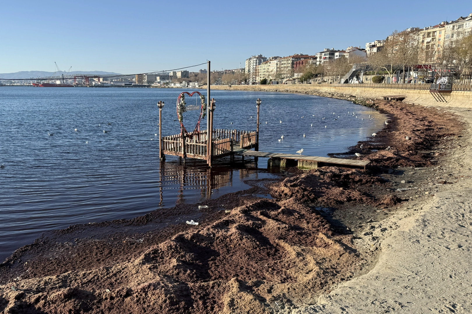 Sahildeki bazı alanlarda kırmızı yosun birikti.