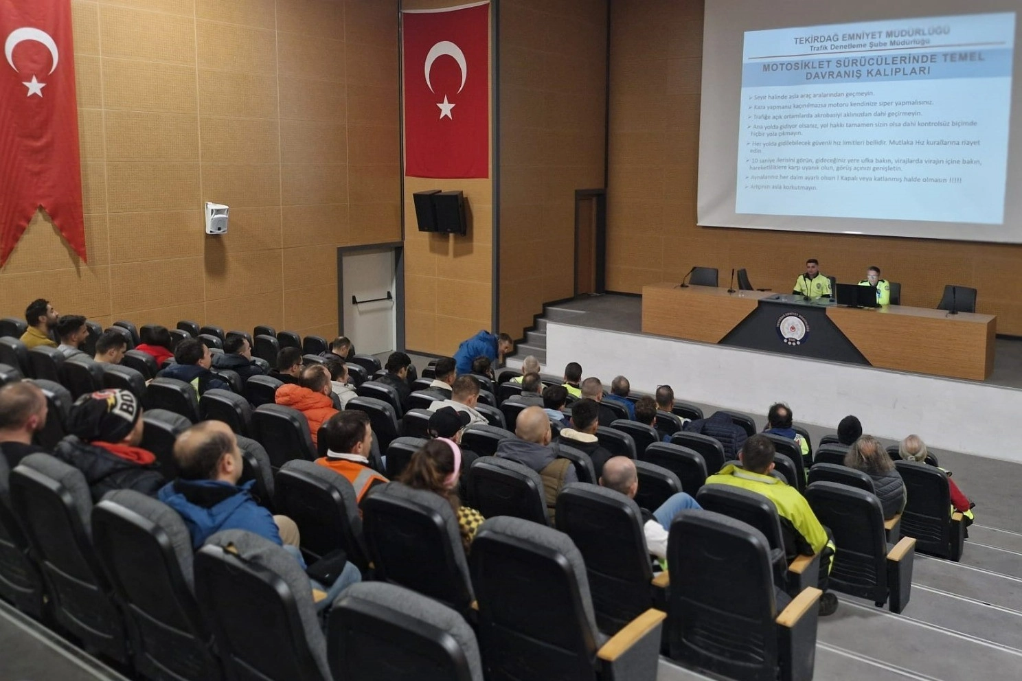 Tekirdağ Emniyet Müdürlüğü Trafik Denetleme Şube Müdürlüğü tarafından Emniyet Müdürlüğü Konferans Salonu’nda düzenlenen toplantıya Tekirdağ Motosiklet Derneği üyeleri, moto-kurye firmalarının yönetici ve çalışanları katıldı. Toplantıda motosiklet sürücülerine, kask kullanımının hayati önemi ve trafikte karşılaşılan tehlikelere karşı alınması gereken önlemler aktarıldı. Eğitim sırasında sürücülere, motosiklet kazalarının nasıl önlenebileceği ve güvenli sürüş kurallarına uyulması gerektiği konusunda detaylı bilgilendirmeler yapıldı. Trafikte "sıfır can kaybı" hedefi doğrultusunda düzenlenen toplantıda, eğitimlerin tüm yol kullanıcıları için daha güvenli bir trafik ortamı oluşturmayı amaçladığı vurgulandı. Tekirdağ Emniyet Müdürlüğü yetkilileri, bu tür bilgilendirme toplantılarının motosiklet kazalarını en aza indirerek sürücülerin, yolcuların ve yayaların güvenliğine katkı sağlayacağını belirtti.