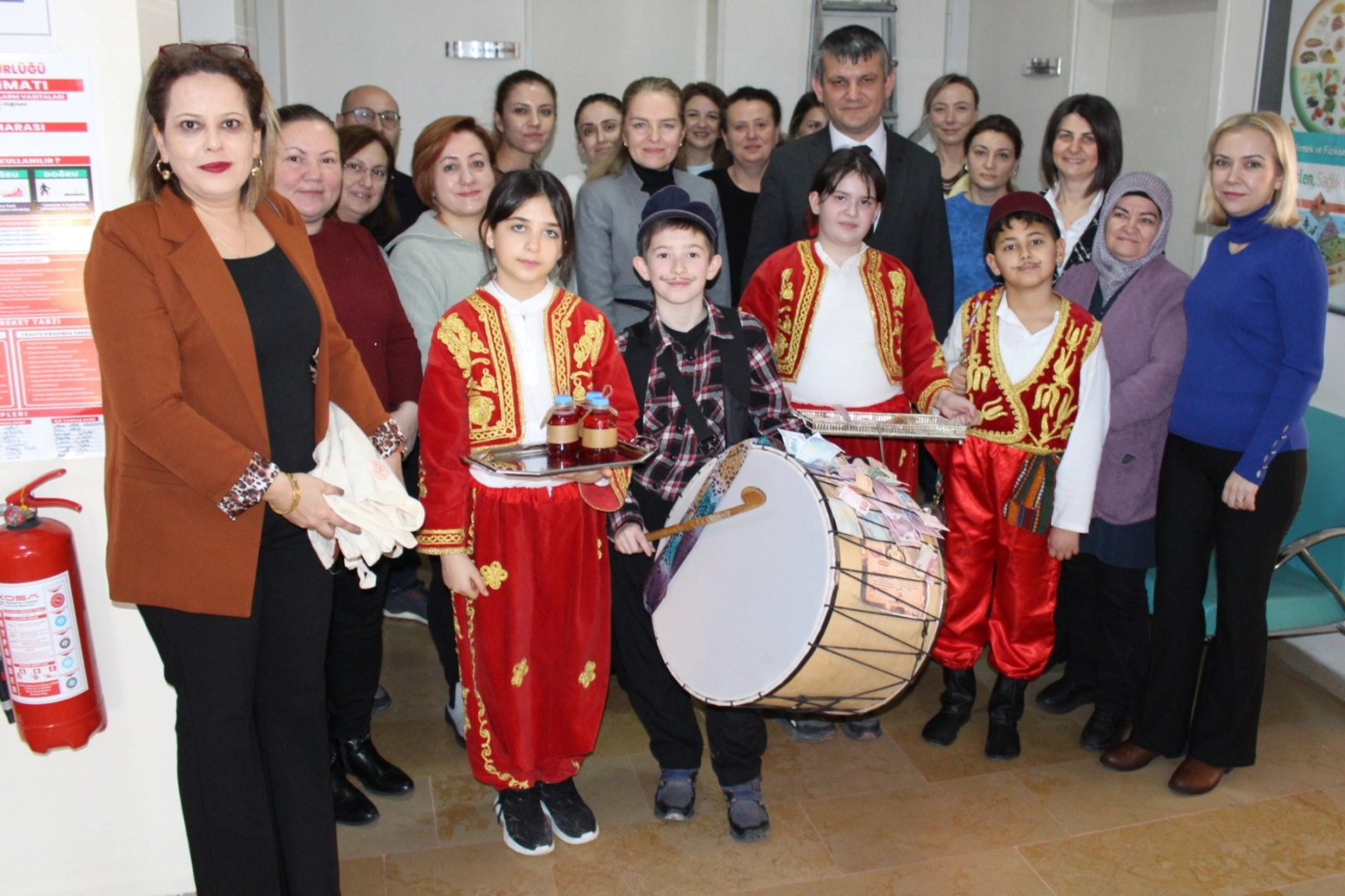 Etkinlikler kapsamında Marmaraereğlisi ilçesindeki Yeniçiftlik Belediye Ortaokulu öğrencileri, İl Sağlık Müdürlüğünü ziyaret ederek sağlık çalışanlarına davul çalıp mani okudu.