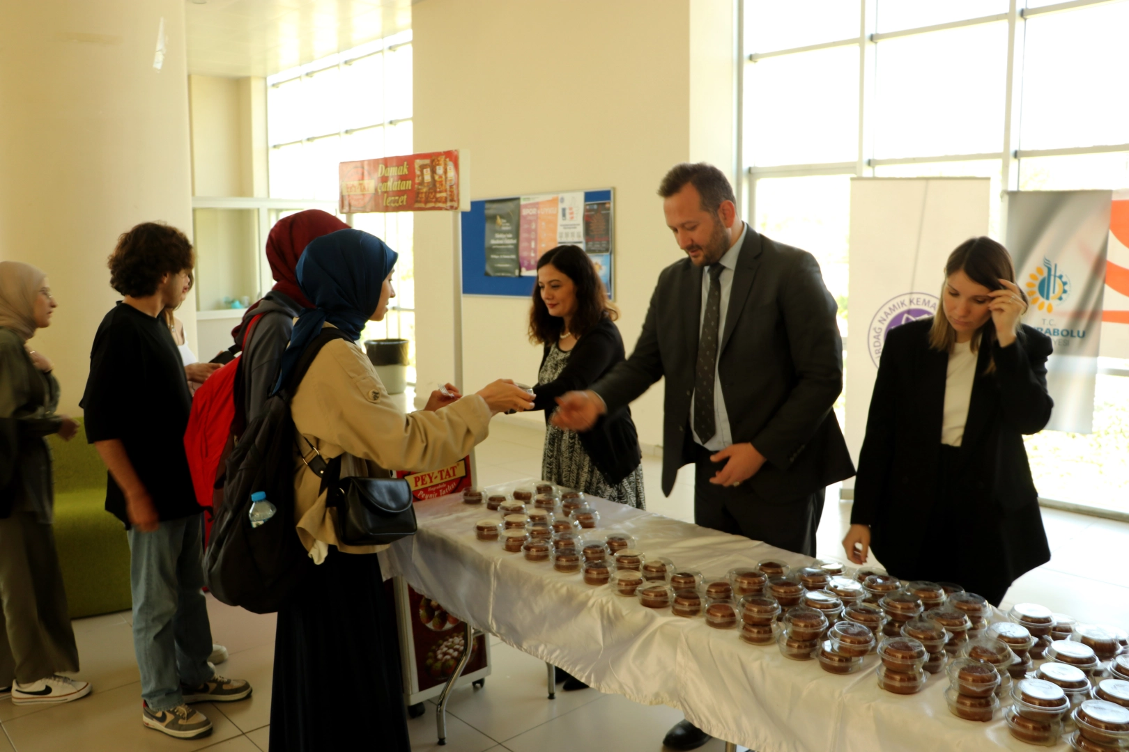 NKÜ Turizm ve Otel İşletmeciliği Bölüm Başkanı Hamide Salha ile İl Kültür ve Turizm Müdürü Ömer Faruk Karaküçük öğrencilere Hayrabolu tatlısı dağıttı.