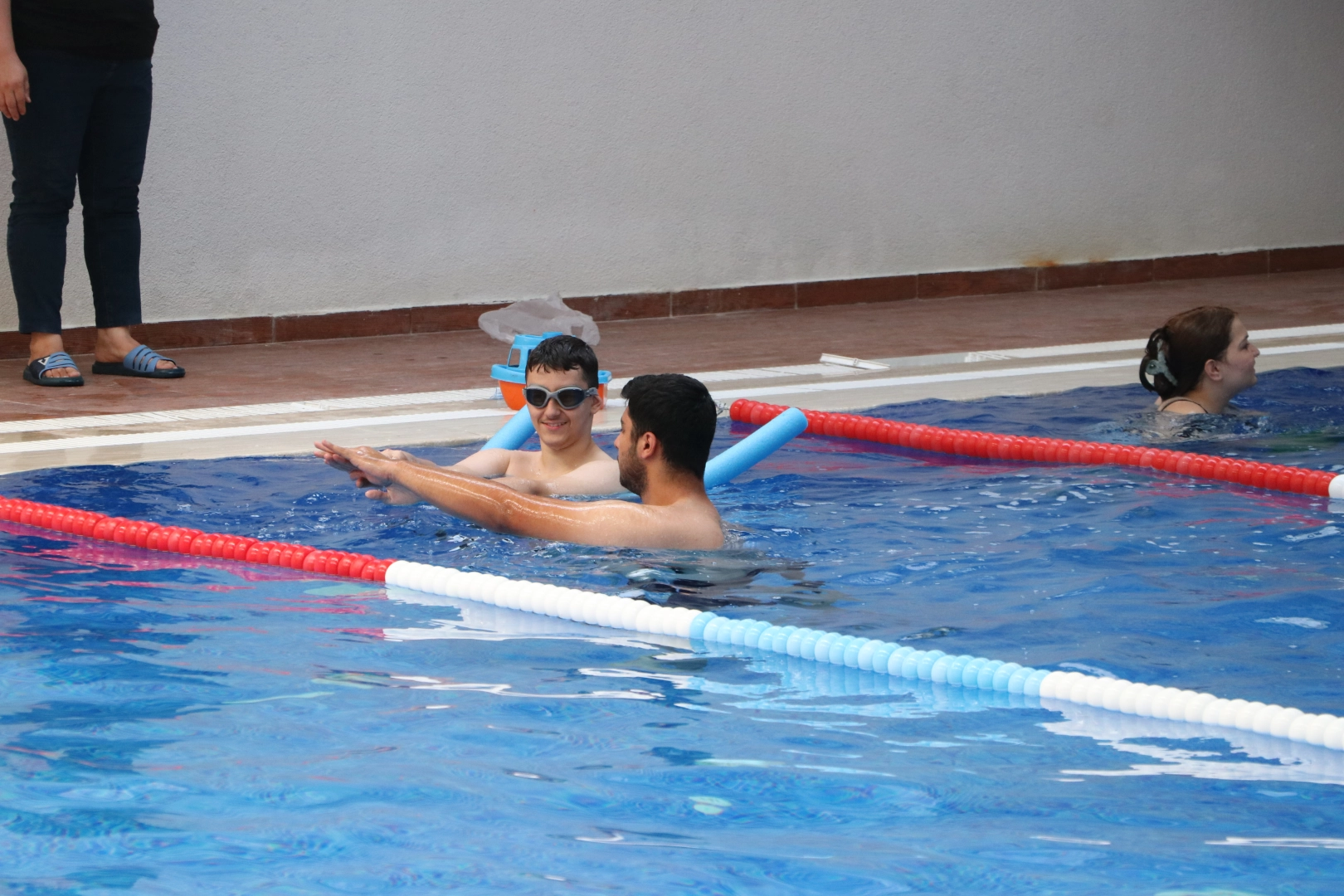 Yüzme antrenörleriyle suya girme korkularını yenerek havuzda yüzme öğrenen özel çocuklar, öz güven de kazanıyor.
