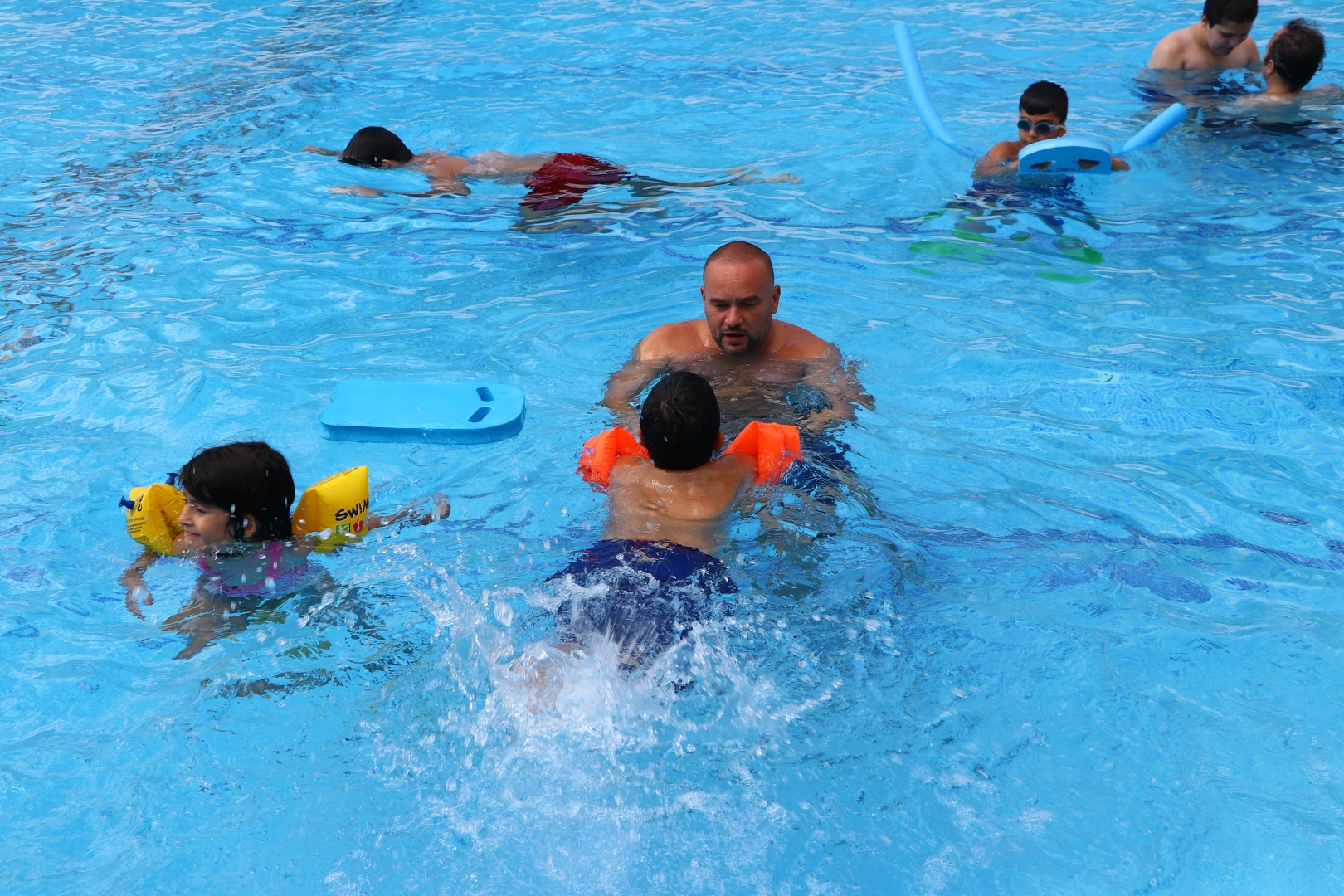 Yüzme antrenörleriyle havuzda engelleri aşan çocuklar, öz güven de kazanıyor.