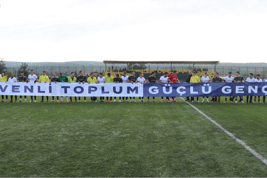 Daha sonra her iki takım sahaya "Güvenli Toplum Güçlü Gençlik" pankartıyla çıktı.