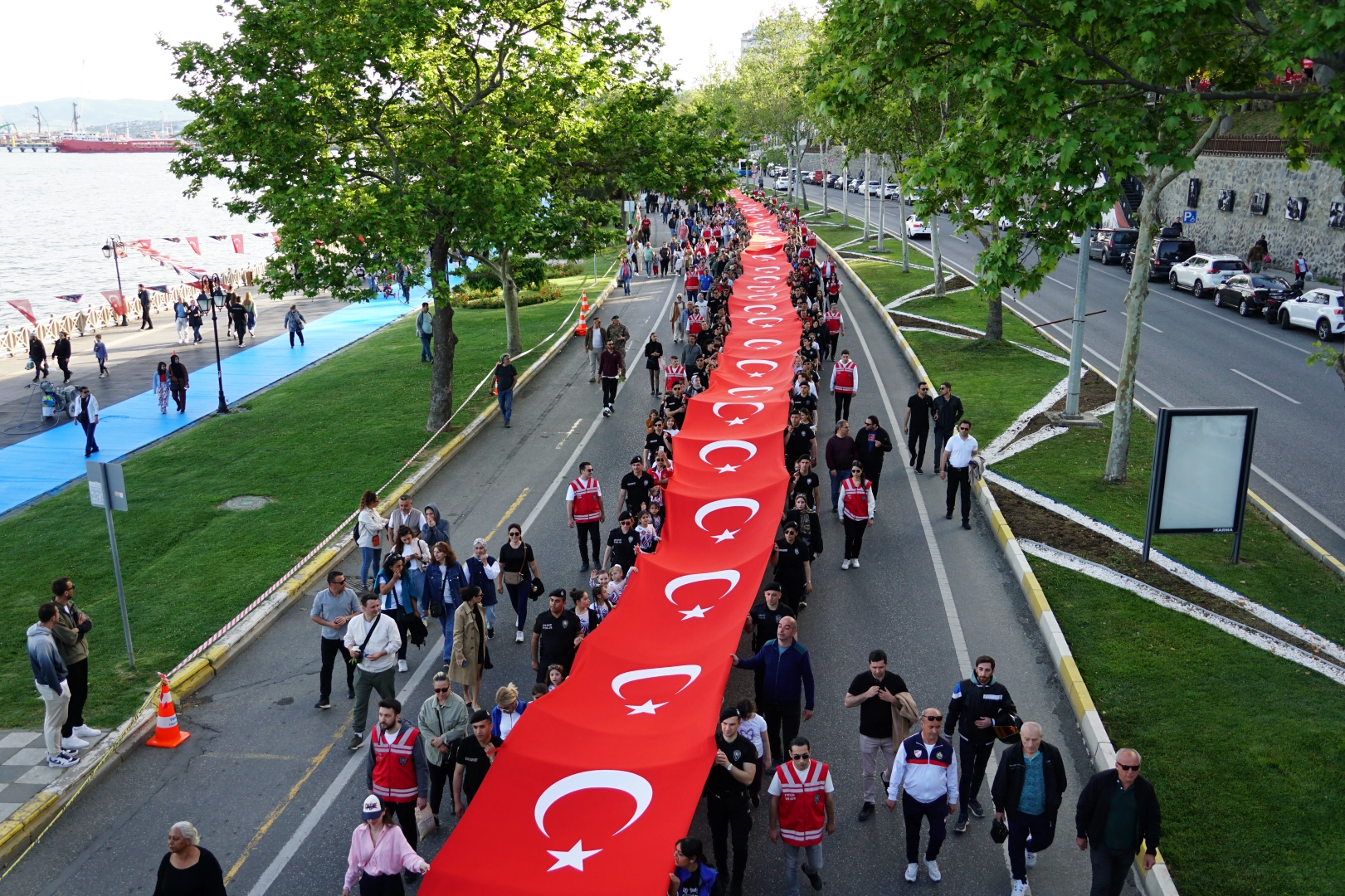 Katılımcılar, 200 metrelik Türk bayrağıyla Atatürk Caddesi'nden Barış ve Özgürlük Parkı'na yürüdü.