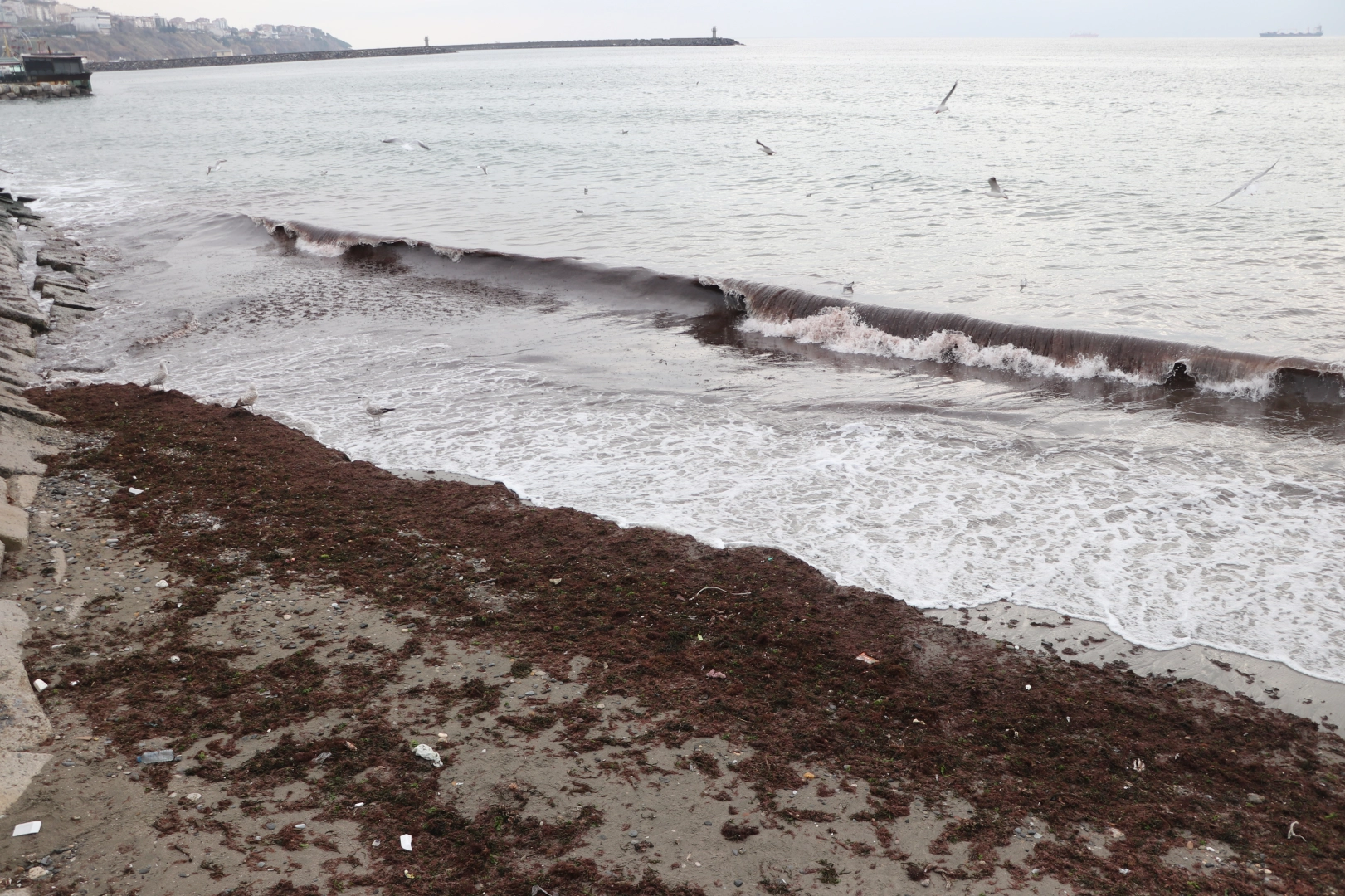 Kentte 5 gündür etkili olan poyrazla oluşan dalgalar, kıyıya yosun ve çeşitli atıkları sürükledi.