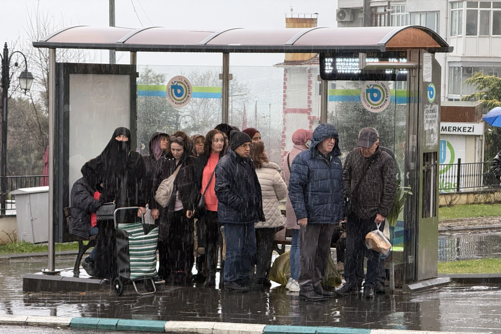 Yağmura hazırlıksız yakalanan bazı vatandaşlar şemsiyelerle korunmaya çalışırken, bazıları otobüs durakları ve bina girişlerine sığındı.