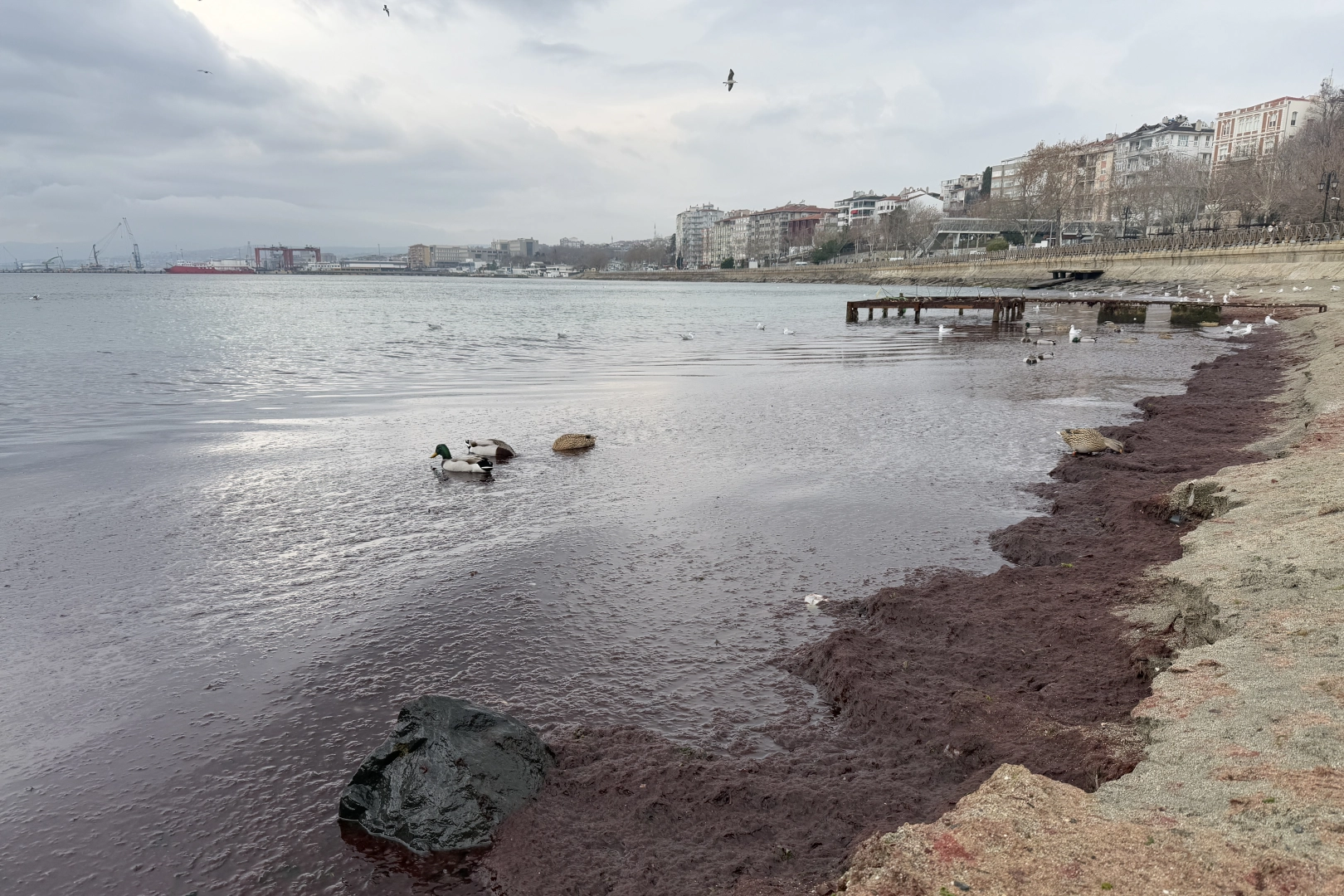 Sahildeki bazı alanlarda kırmızı yosun birikti.