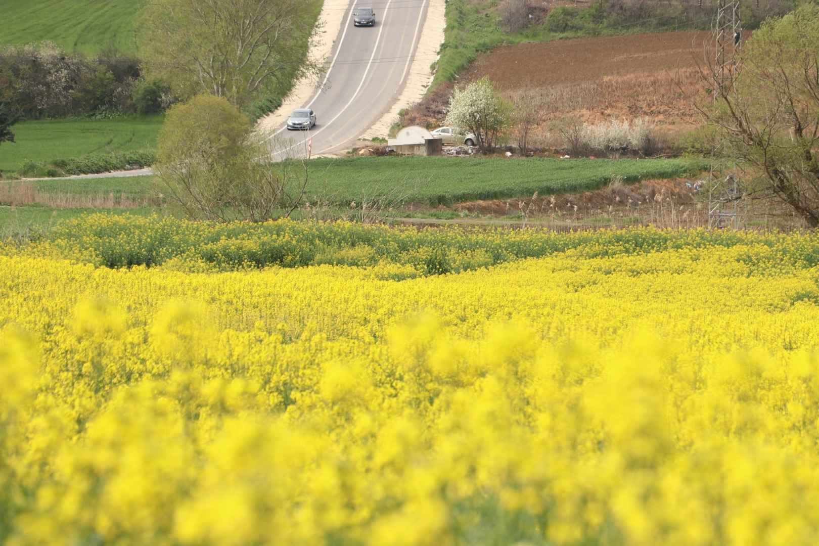 Kanola bitkisinin çiçeklenme dönemine girmesiyle sarı ve yeşil tonlar iç içe geçti.