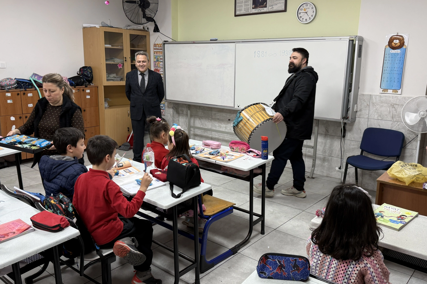 Etkinlikler kapsamında Süleymanpaşa İlkokulu'nda Halk Oyunları Eğitmeni Gürkan Yeşil, sınıflarda davul çalıp öğrencilere mani okudu.