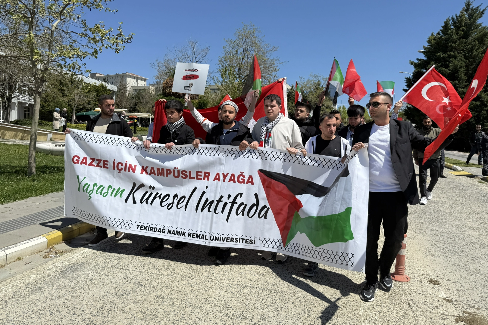 Üniversite yerleşkesindeki Tatbikat Camisi yanında İHH İnsani Yardım Vakfı Tekirdağ Temsilciliğinin düzenlediği yürüyüş için toplanan grup, "Tüm uyuyanları uyandırmak için bir Gazze yeter" ve "Özgür Kudüs, özgür Filistin" yazılı pankartlar açarak yürüyüşe geçti.