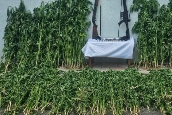 Aramada, 1313 kök Hint keneviri, 77 gram esrar, 18 led aydınlatma, 2 iklimlendirme çadırı, termometre, havalandırma sistemi, 2 ruhsatsız tabanca, 2 ruhsatsız av tüfeği ve 80 tabanca fişeği ele geçirildi.