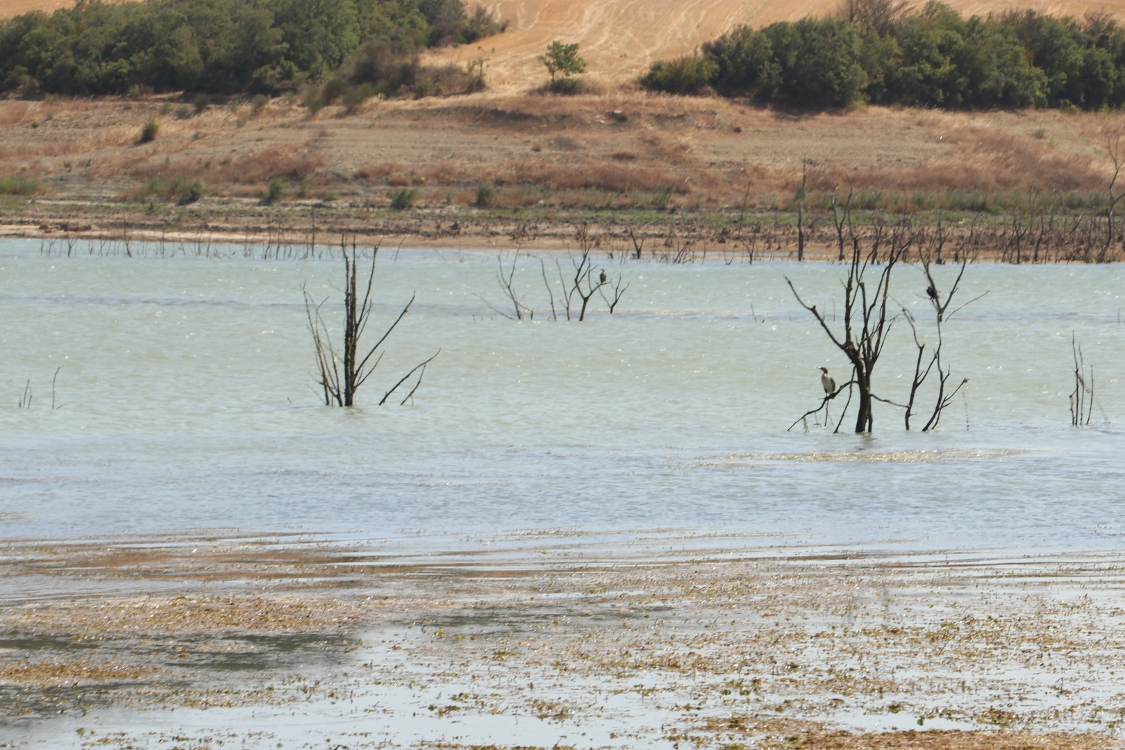 Su çekilmesiyle ortaya çıkan alanlarda otlar ve çamur tabakası dikkati çekiyor.