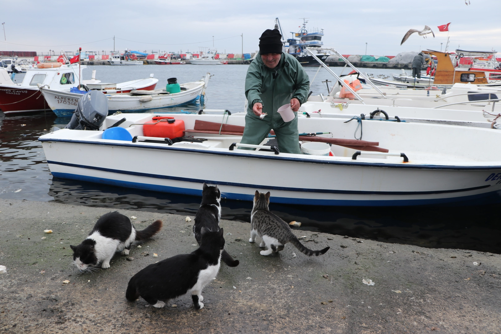 Teknesi ile her gün denize açılan Saygı, rıhtımdaki balıkçı barınağına döndükten sonra avladığı balıklardan kedilere vermeye başladı.