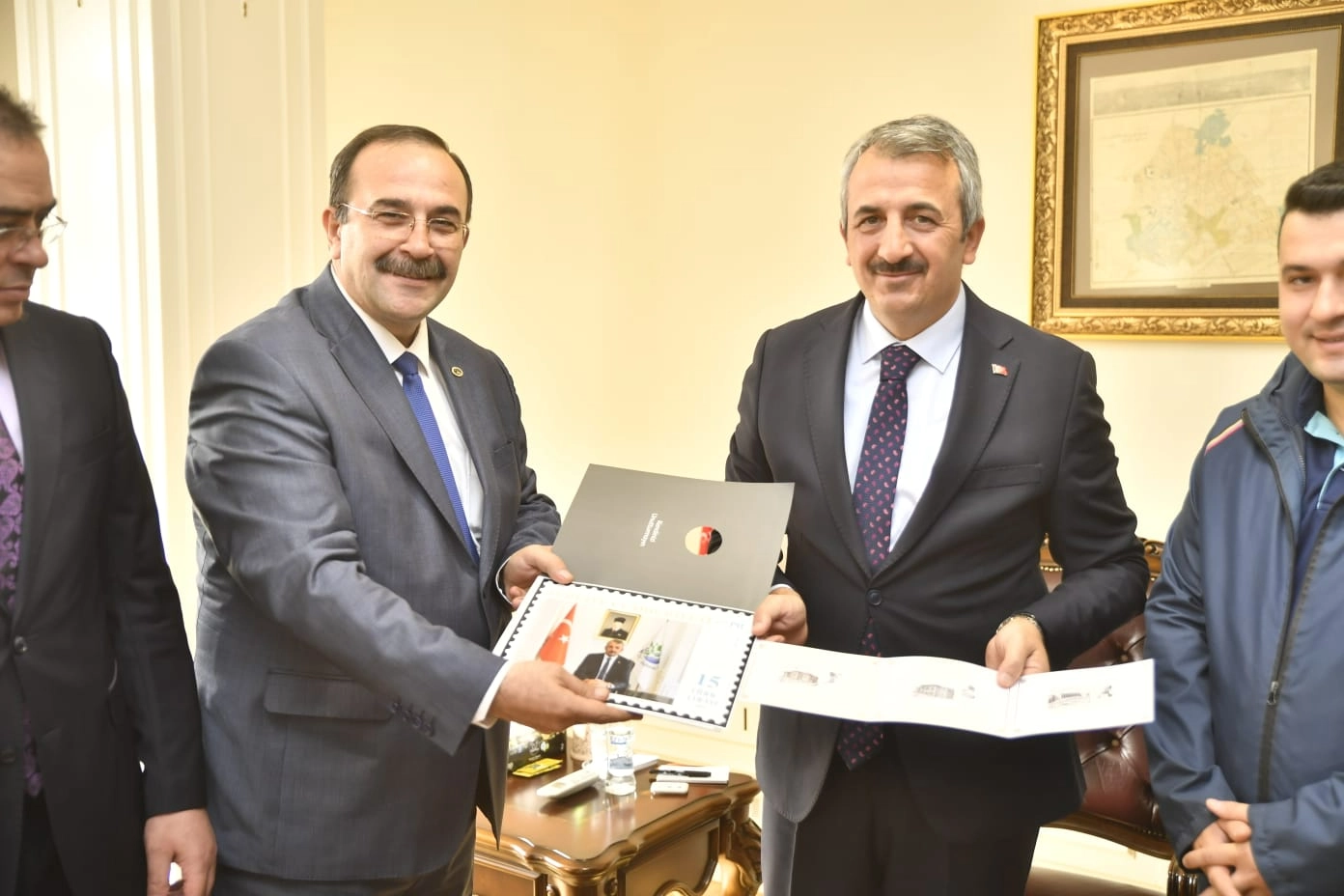 Gerçekleşen ziyarette Akalın, Vali Sezer'e fotoğrafının yer aldığı posta pulu hediye etti.