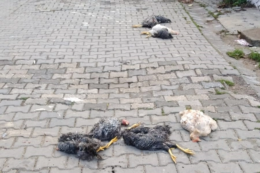 Olay, İstiklal-Kurtpınar Mahallesi 43. Sokak Salim Malcılar Caddesi üzerinde meydana geldi. Sokağın ortasında etrafa dağılmış vaziyetteki telef olmuş tavuk ve horozlar görenleri tedirgin etti. Belediye Temizlik İşleri Müdürlüğü ekiplerince hayvanlar yol üzerinden kaldırıldı. Hayvanların nasıl öldüğü ise bilinmiyor.