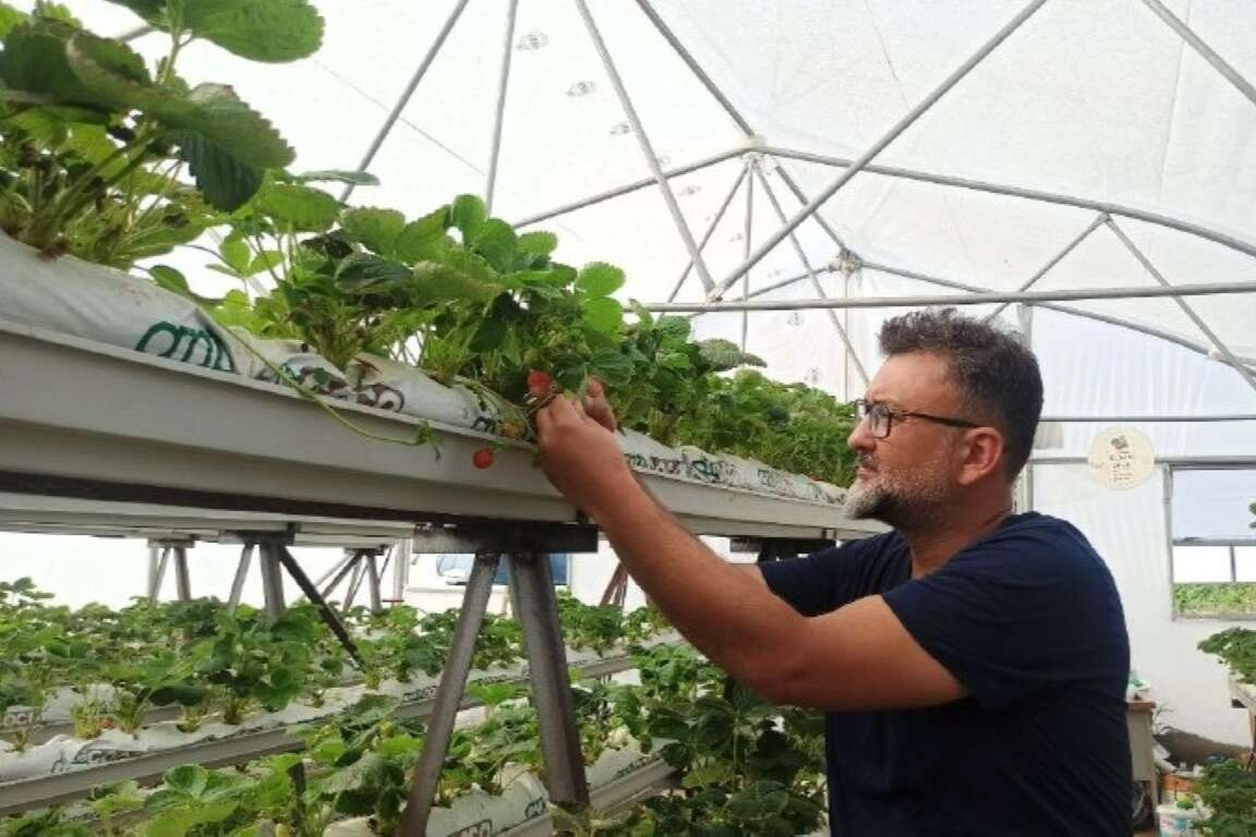Sakarya, Keşan'da ilk kez kendisinin deneyeceği topraksız çilek üretimi için 250 metrekarelik sera kurdu.