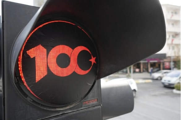 Belediye ekiplerinin çalışmasıyla trafik ışıklarına yerleştirilen 100’üncü yıl görselleri kırmızı ışık yandığında görünür hale geliyor.