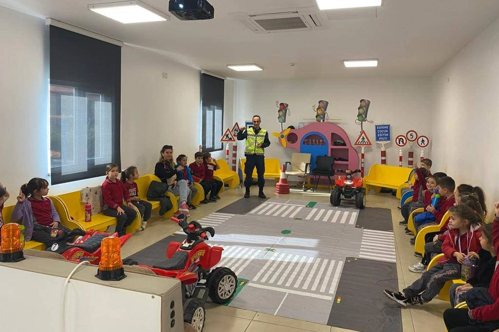 Edirne İl Jandarma Komutanlığı Trafik Jandarması Timleri tarafından Edirne Merkez ilçesinde bulunan Çocuk Trafik Eğitim Parkı'nda Trakya Birlik İlkokulu 1. sınıf öğrencilerine "temel trafik kuralları" konusunda eğitim verildi.