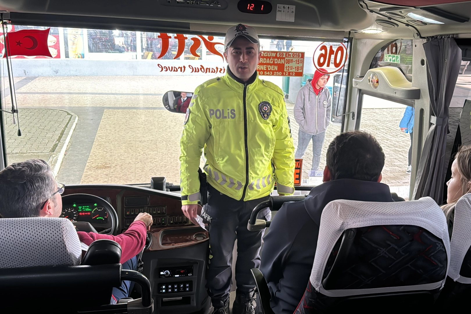 Otogarda şehirler arası yolcu taşımacılığı yapan otobüs ve minibüslerde kontrolde bulunan ekipler, otobüslerdeki yolcuları emniyet kemeri takmaları, sürücüleri ise hız yapmamaları yönünde uyardı.