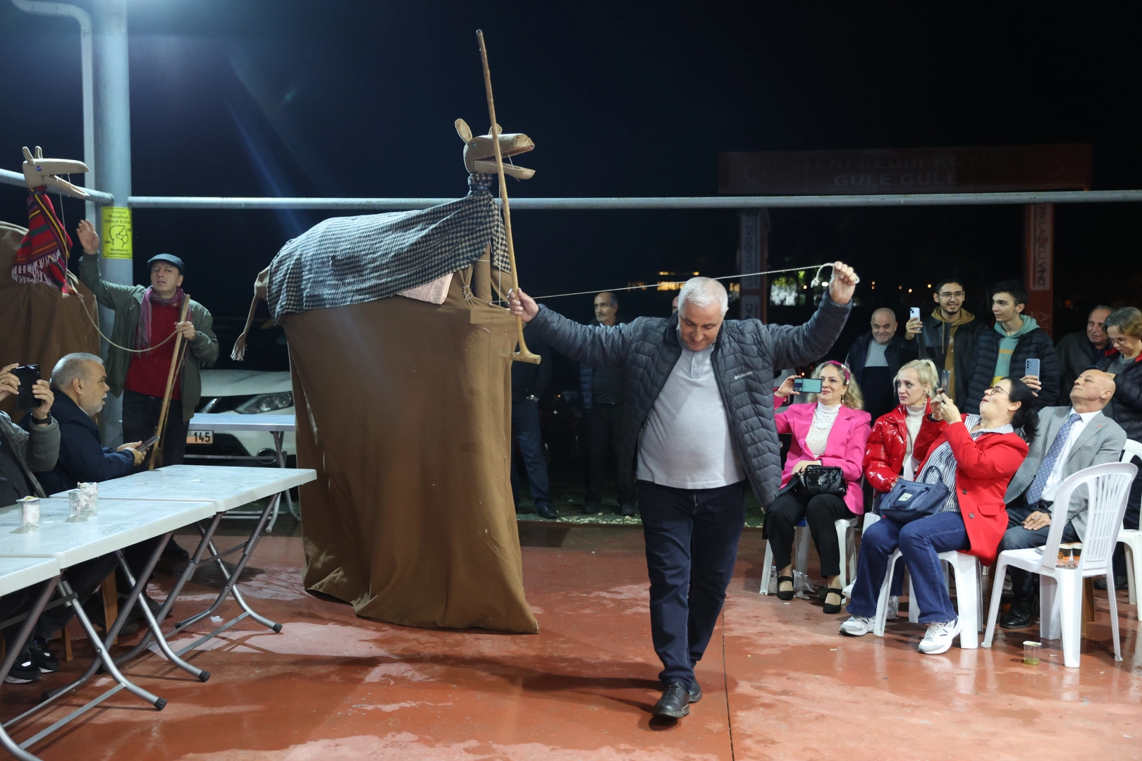 Etkinliğin bir bölümünde iki kişinin sırtına yerleştirilen kalasların üstünün kilim ve çulla örtülmesiyle hazırlanan temsili deve, maniler eşliğinde düğün alanında gezdirildi.