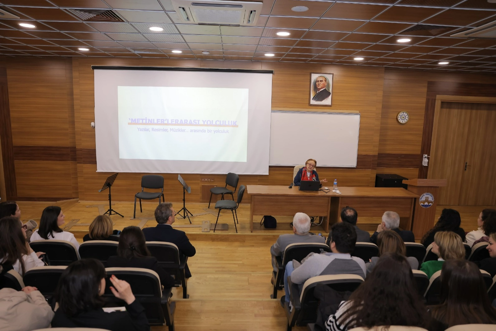 Metinlerarasılığın farklı metinler arasında kurulan diyalogları ifade ettiğini söyleyen Ataseven, bu kavramın diğer sanat dallarında da geçerli olduğunu belirterek “resimlerarasılık” ve “müziklerarasılık” gibi yeni açılımlara değindi. Sanatta anlam üretiminin çok katmanlı bir süreç olduğunu örneklerle açıklayan Ataseven, katılımcılardan yoğun ilgi gördü.