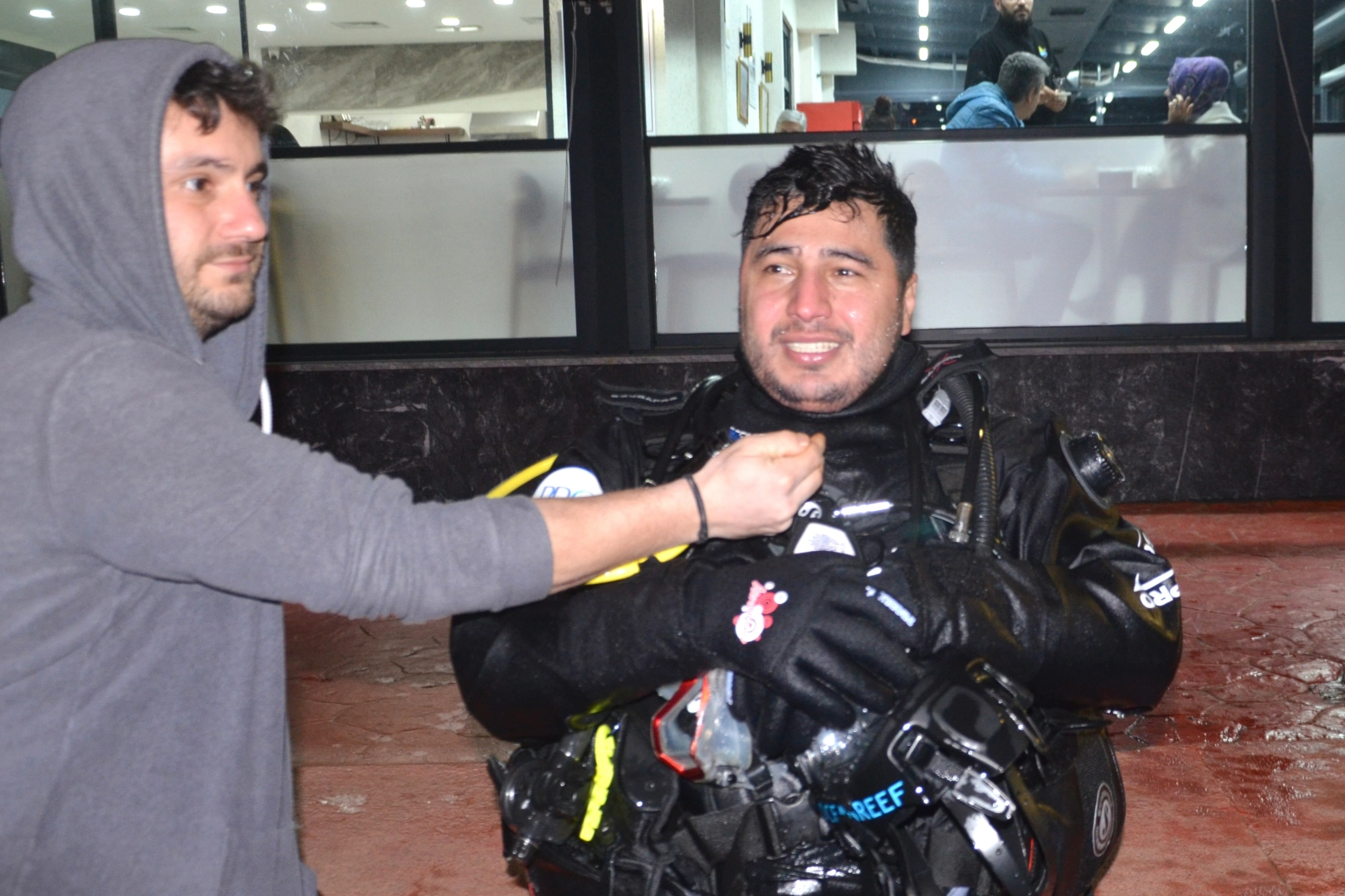 Deneme dalışını izleyen KARSAD Başkanı Zeki Şirinoğlu ve dalgıçlar da Kibar'a başarı dileklerini iletti.