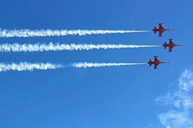 Türk Yıldızları'nın gökyüzündeki gösterisini heyecanla izleyenler, cep telefonlarıyla o anları kaydederken pilotları da yaptıkları etkileyici hareketler karşısında alkışladı.