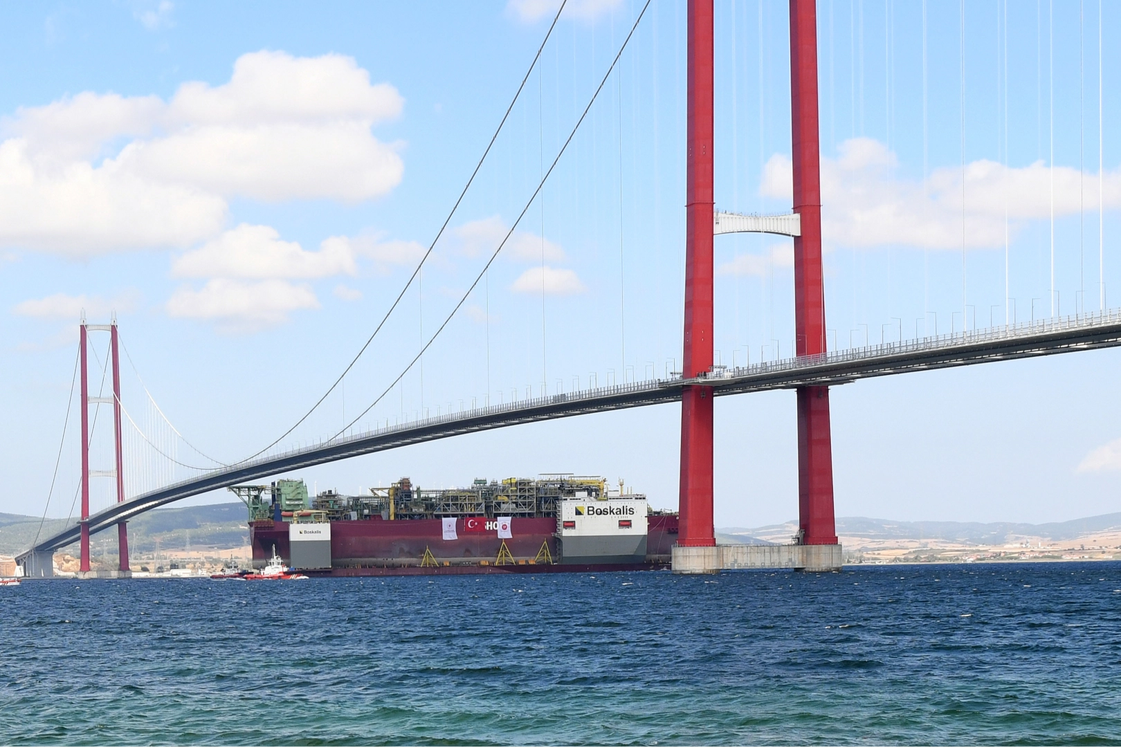 2026 yılında Sakarya Gaz Sahası'nda devreye girerek günlük 10 milyon metreküp doğal gaz işleyecek olan Türkiye'nin ilk yüzer doğal gaz üretim platformu, saat 08.45'te Çanakkale Boğazı'na giriş yaptı.
