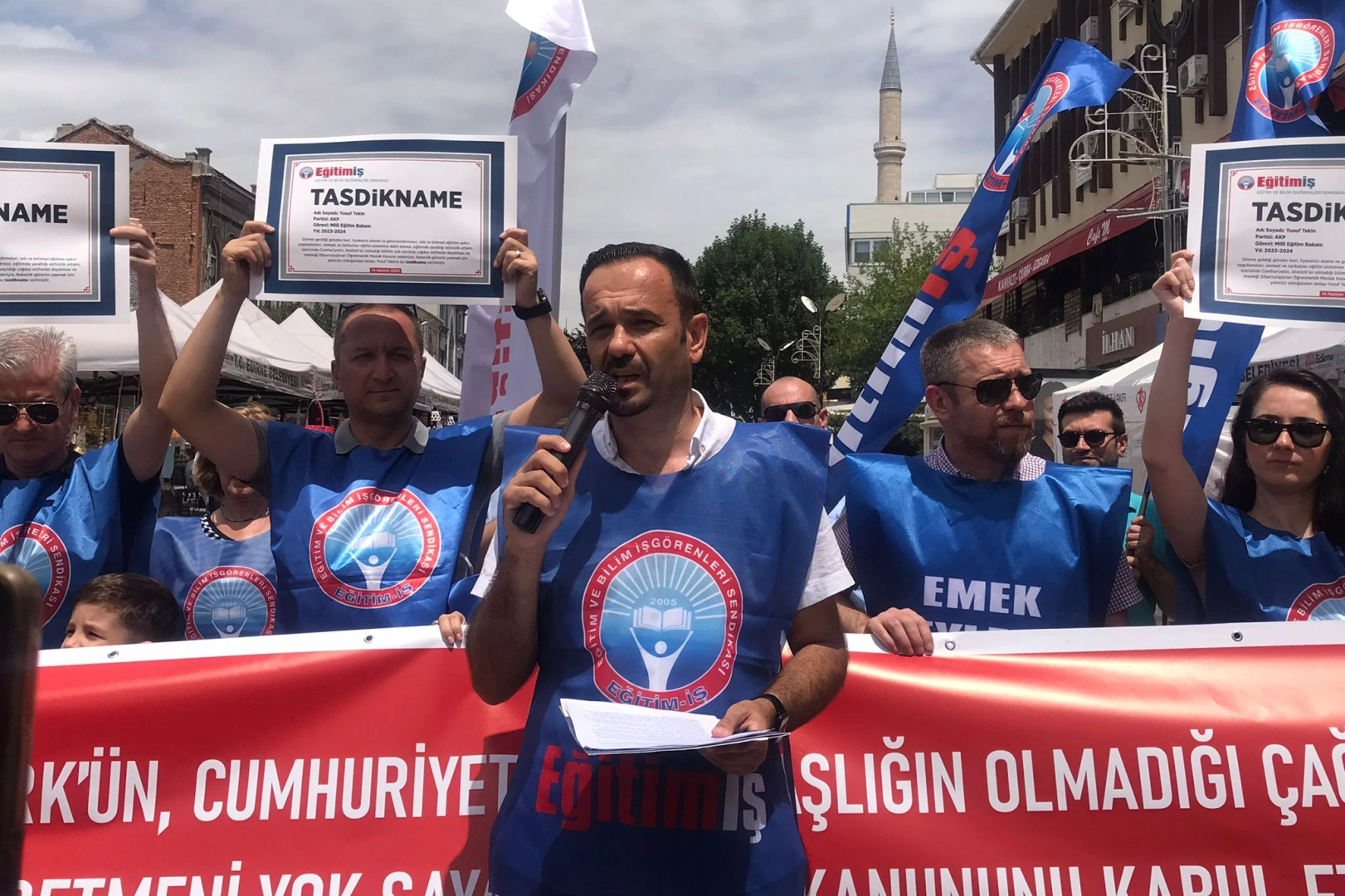 Eğitim-İş Edirne Şubesi, 2023-2024 Eğitim-Öğretim döneminde, eğitimde birçok değişikliğin yaşanmasıyla ilgili Saraçlar Caddesi’nde basın açıklaması yaptı. Basın açıklamasını okuyan Eğitim-İş Edirne Şube Başkanı Nedim Zobar, “Türkiye Yüzyılı Maarif Modeli” adını taşıyan yeni müfredatın, kamuoyunun itirazlarına rağmen eğitimin belkemiğine yerleştirildiğini, laik ve çağdaş eğitim yok edildiğini söyledi.