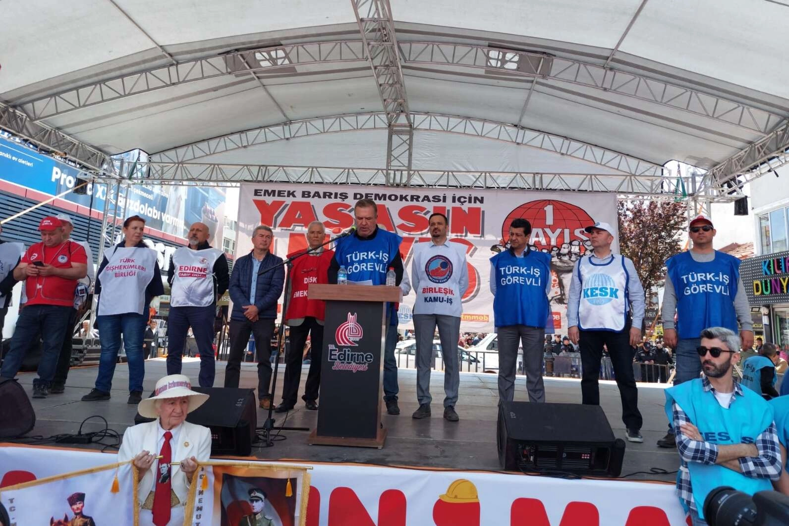 1 Mayıs mitingi sırasında tertip komitesi adına bildiriyi okuyan Şişko’ya Birleşik Kamu - İş Konfederasyonu Edirne İl Temsilcisi Nedim Zobar, KESK Edirne Platform Sözcüsü Özer Demir,