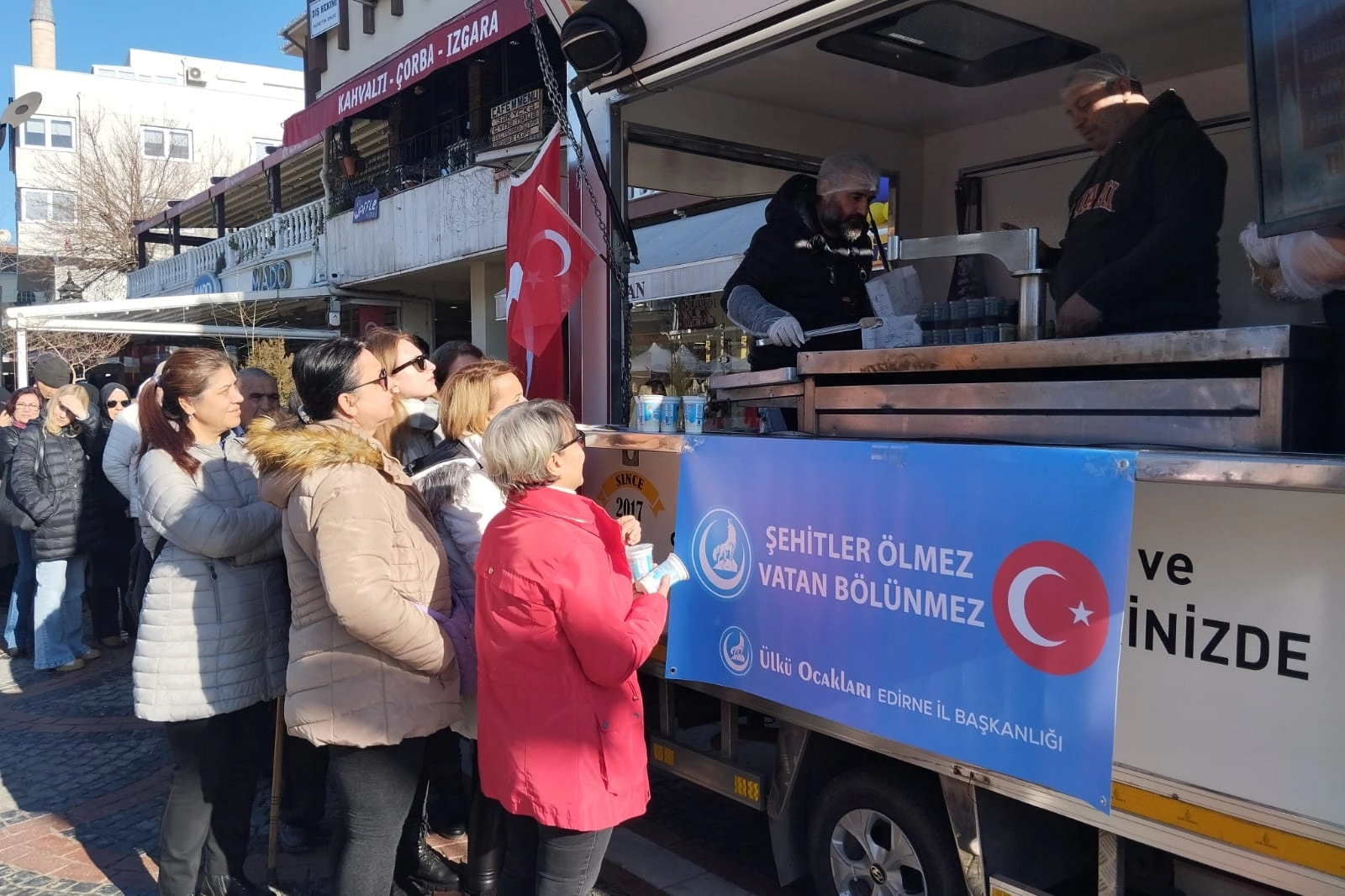 Bugün Saraçlar Caddesi’ndeki PTT binası önünde dağıtılan lokmalar bin kişiye ulaştırıldı. Ülkü Ocakları Edirne İl Başkanı Olgun Birbey Şahinbaş yaptığı açıklamada, “Cuma ve Cumartesi günü Irak’ın kuzeyinde bölücü terör örgütü tarafından yapılan alçakça saldırı sonucu şehit olan 12 askerimiz için Ülkü Ocakları Edirne İl Başkanlığımız olarak öğlen saatlerinde bin kişilik lokma dağıtmaktayız. Şehitlerimizin ruhu şad olsun, mekanları cennet olsun” dedi.