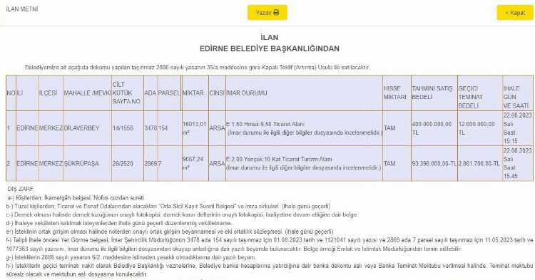 Edirne Belediyesi tarafından satışa çıkarılan Ulus Pazar yeri satılamadı. Edirne Belediyesi Encümen Salonu’nda bugün kapalı zarf usulü ile yapılması planlanan ihaleye katılan olmadı.