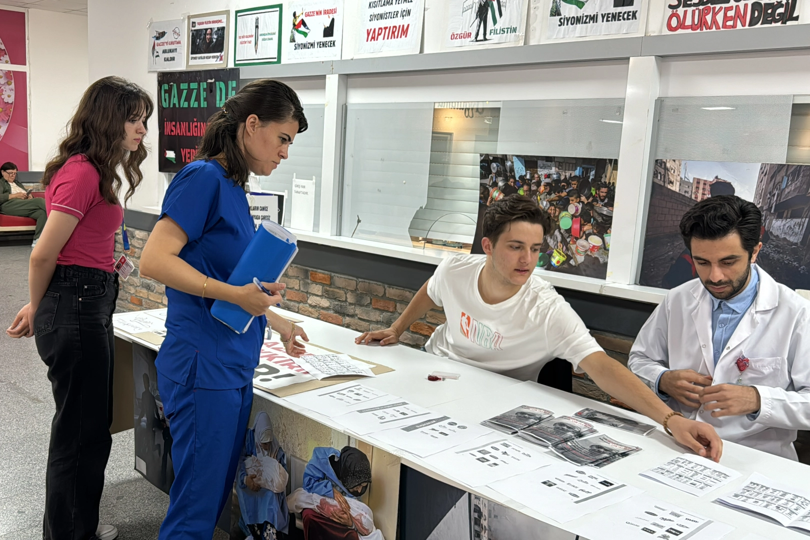 Gazze'ye yönelik saldırıları protesto etmek ve farkındalık oluşturmak isteyen öğrenciler broşürlerle vatandaşları ve sağlık çalışanlarını İsrail ürünlerinin kullanılmaması, onların yerine kullanılabilecek ürünler hakkında bilgilendirdi.