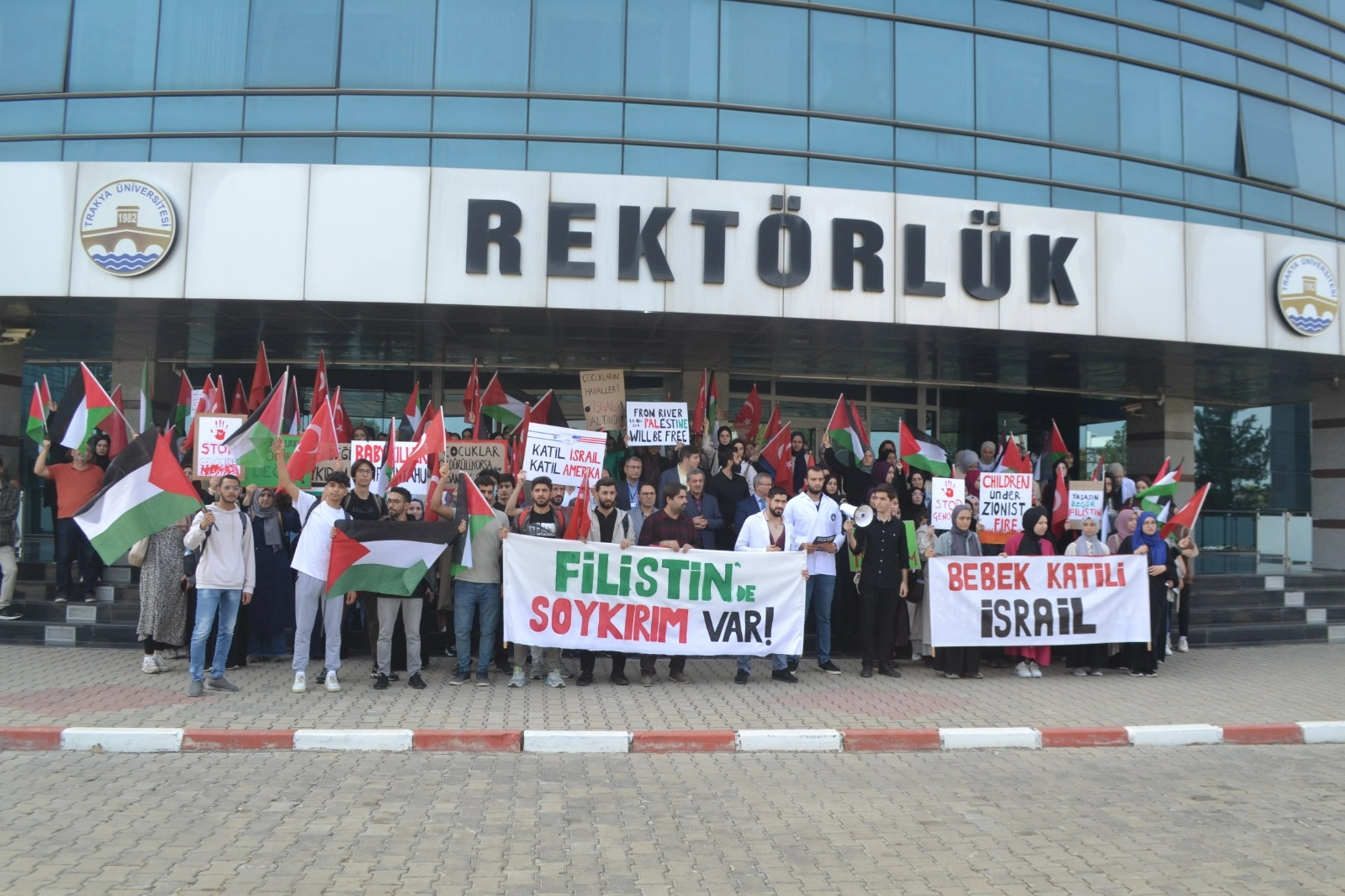 Rektör Tabakoğlu burada yaptığı açıklamada, Filistin’de yaşananlarla ilgili sessiz kalamayacaklarını söyleyerek öğrencilere desteğini açıkladı. Rektör Tabakoğlu; “Trakya üniversitesi olarak bu katliamı kabul etmiyoruz. Çok acı günler geçiriyoruz. Küvözlerde nefes alamayan, üzerine bombalar atılan çocuklarla biz de ölüyoruz. Bu vahşeti şiddetle kınıyoruz” dedi.