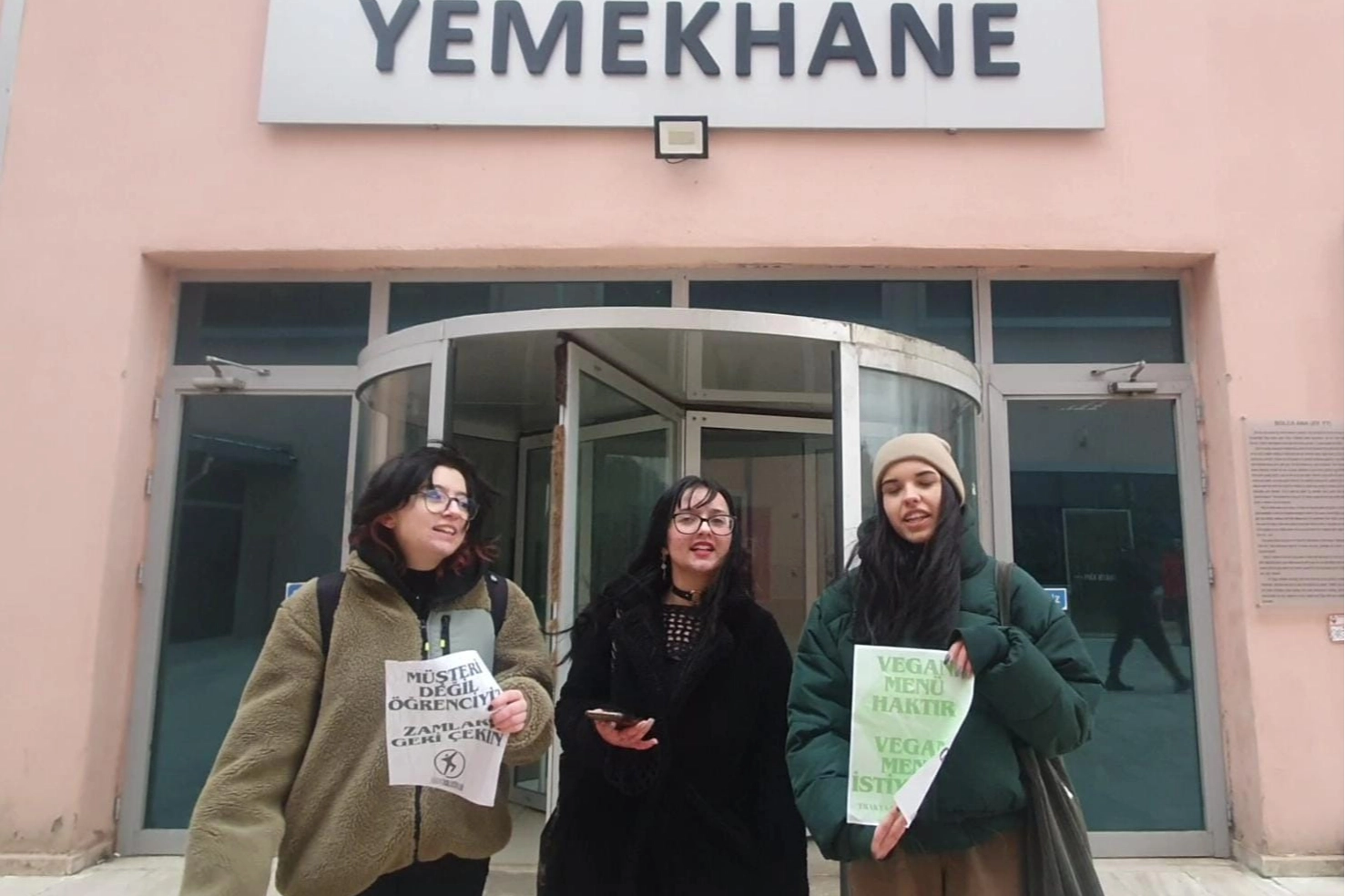 Trakya Üniversitesi’nde (TÜ) bir grup öğrenci tarafından Bolca Ana Yemekhanesi önünde yemekhanenin fiyatlarını protesto ederek, vegan menü taleplerini dile getirdiler. Öğrenciler, “Vegan menü haktır, görmezden gelme. Ücretsiz yemek haktır, görmezden gelme. Rektör, zamları derhal geri çek. Müşteri değil, öğrenciyiz” dediler.