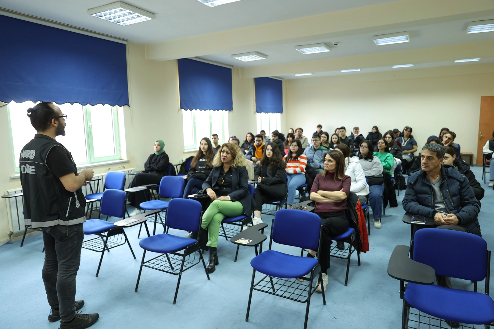 Narkotik Şube Müdürlüğü'nde görevli polis memurları üniversite öğrencilerine tütün, alkol, uyuşturucu, teknoloji ve kumar bağımlılığı ile bağımlılıktan korunma konusunda bilgiler verdi.