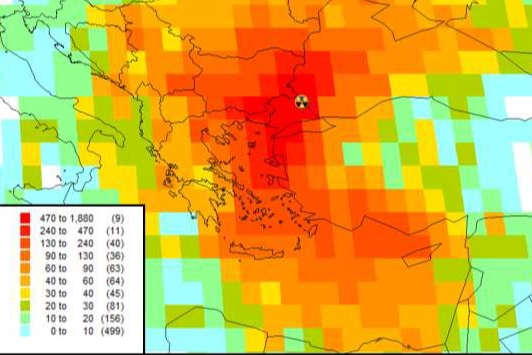 Nükleer kaza veya sızıntı olması durumunda Balkanların önemli bir bölümü, tüm Ege bölgesi ve Ege denizi turuncuyla gösterilmiş ve etkilenecek bölgeler olarak işaretlenmiş.
