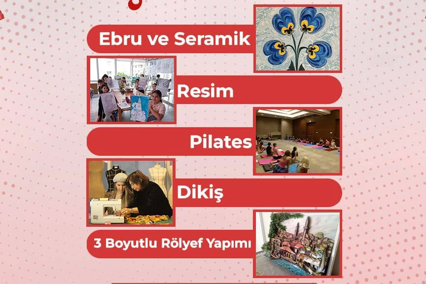 Ebru ve Seramik Kursu, Resim Kursu, Pilates Kursu, Dikiş Kursu, 3 Boyutlu Rölyef Yapımı Kursu yer alıyor.