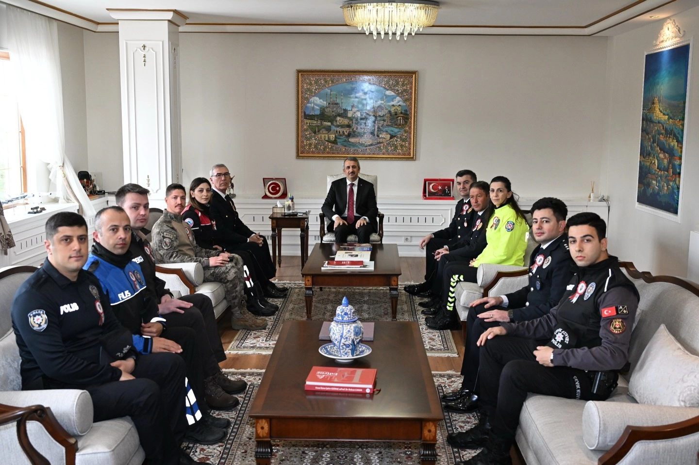 Edirne İl Emniyet Müdürü Muhittin Ayhan ve beraberindeki emniyet mensupları, Türk Polis Teşkilatının 181. kuruluş yıl dönümü kapsamında Edirne Valisi Yunus Sezer’i makamında ziyaret etti.