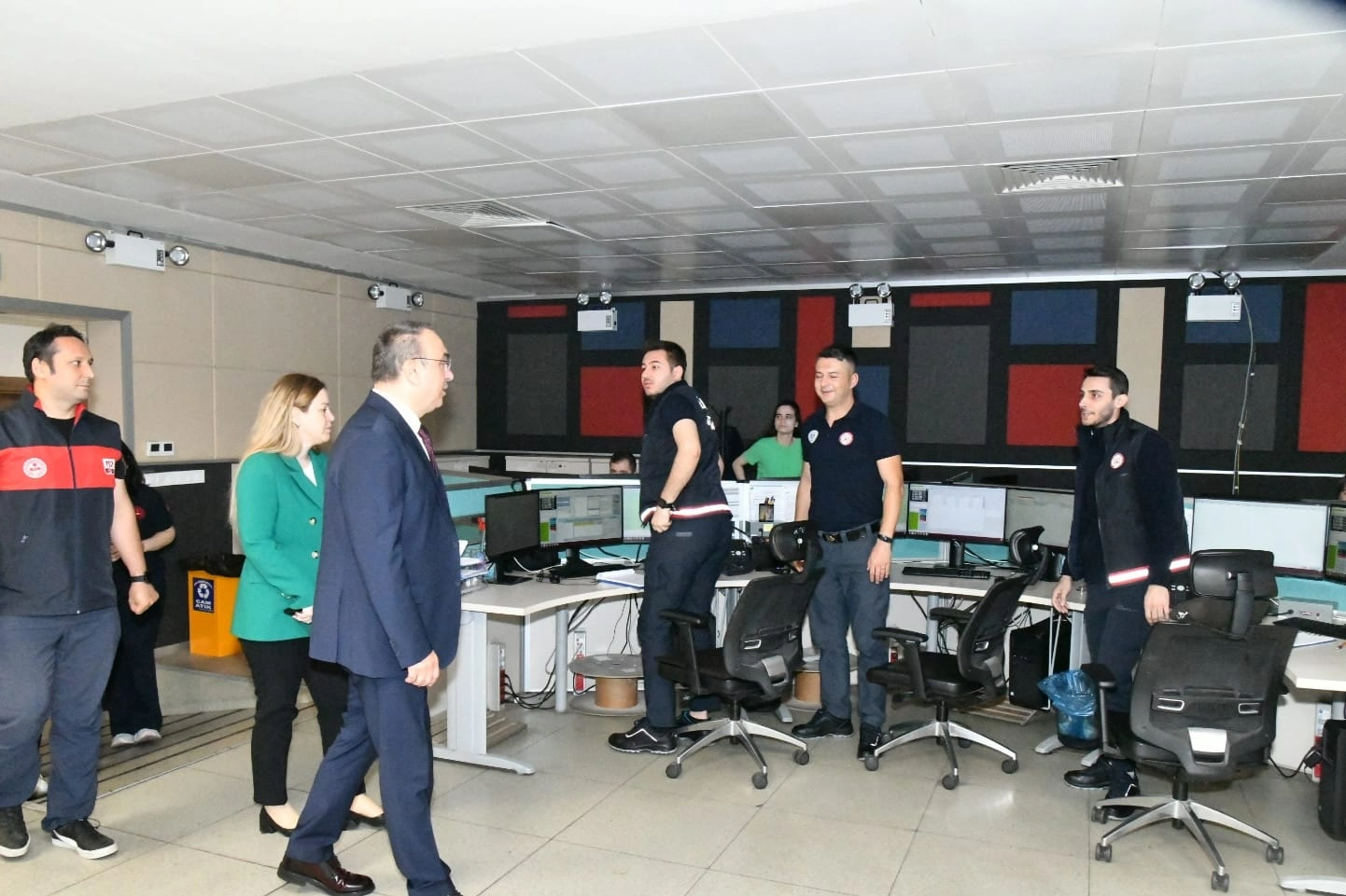 Kurumu gezerek incelemelerde bulunan Vali Soytürk, 112 Acil Çağrı Merkezi Müdürü Selma Ergönül’den kurumun çalışmaları hakkında bilgi aldı.