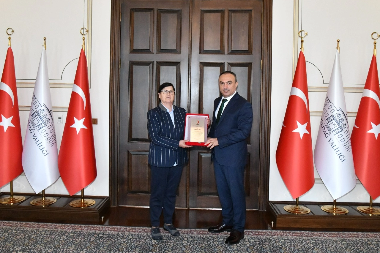 Bu kapsamda, Türk Kızılayının gönderdiği gümüş madalya beratı ve plaket, Türk Kızılayı Derneği Tekirdağ Şube Başkanı Hamiyet Çizen tarafından Vali Soytürk’e taktim edildi.