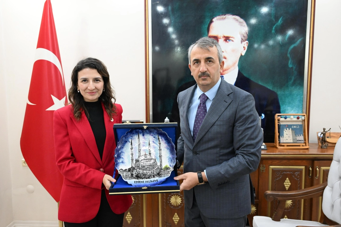 Edirne Valiliği’nden yapılan açıklamaya göre, Vali Yunus Sezer, Enez Kaymakamı olarak göreve başlayan Merve Ayık’a hayırlı olsun ziyaretinde bulundu. Ziyarette, Ayık’a yeni görevinde başarı temennilerini ileten Sezer, kamu hizmetlerinin etkin ve verimli şekilde yürütülmesinin önemine vurgu yaptı. Görüşmenin karşılıklı iyi dileklerle sona erdiği bildirildi.